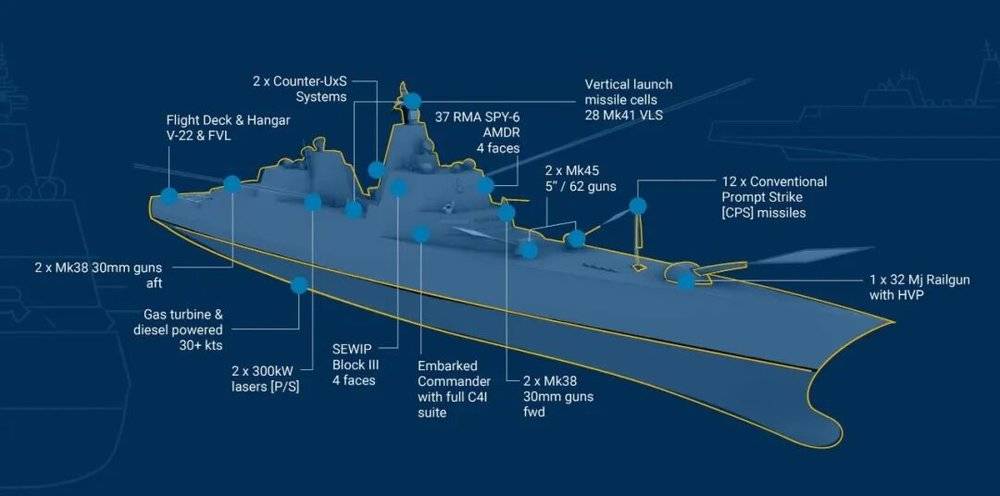 此外,这些舰船将具备加装电磁轨道炮和定向能武器等未来武器的能力。该级舰搭载的导弹包括:核武装海基巡航导弹(SLCM-N)系统、12单元常规快速打击(CPS)高超声速导弹系统、128单元Mark 41垂直发射系统(VLS)。最继承战列舰精神的是一门32兆焦耳电磁轨道炮,还有两门127毫米火炮、两门300千瓦激光炮。防御上,新舰配备两套拉姆近程防空导弹发射器、四门30毫米火炮、四台ODIN激光炮、两套反无人机系统。