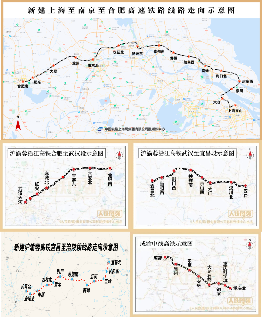 由北沿江高铁、合武高铁、武宜高铁、渝宜高铁、成渝中线高铁等段构成。