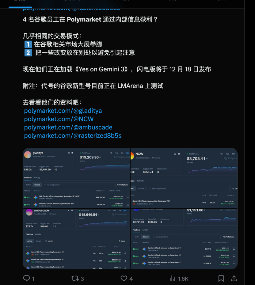 这人平时啥也不投,像个隐形人。在Gemini 3.0 Flash预测之外,其他预测寥寥,最多押注也不超过1000美元。