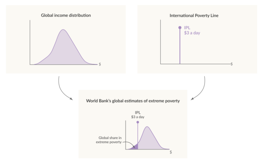 世界银行将国际贫困线锚定在低收入国家采用的国家贫困线上。国际贫困线又称为贫困门槛,低于贫困线的人口,无论其生活在哪个国家,都会被视为处于绝对贫困(极端贫困)。