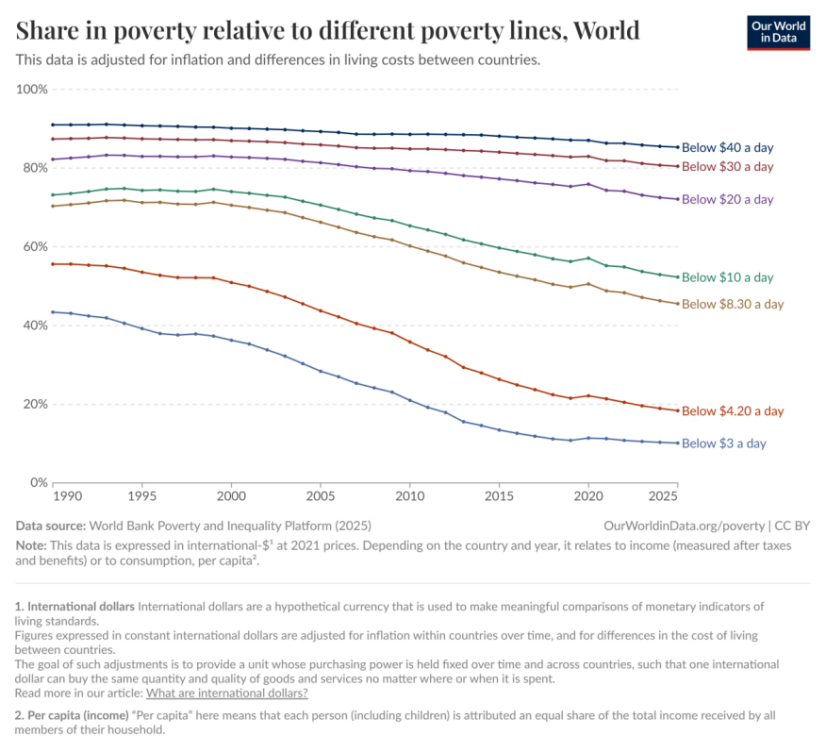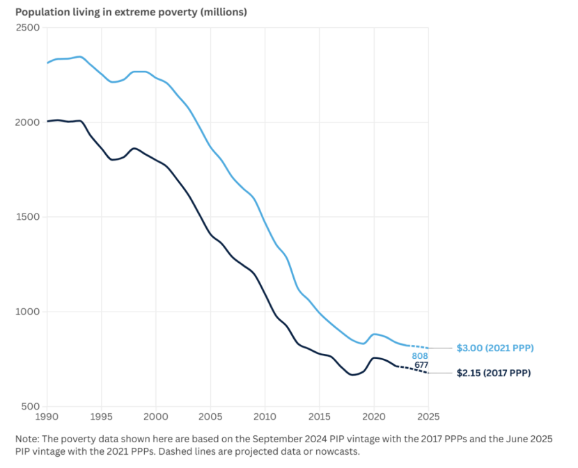 2025年,全球约有8.08亿人生活在极端贫困中(此前估计为6.77亿),或者说,全球有9.9%的人口生活在极端贫困中,十分之一的人每天生活不到3美元,在经济上难以满足基本需求(食物、衣物和住所)。