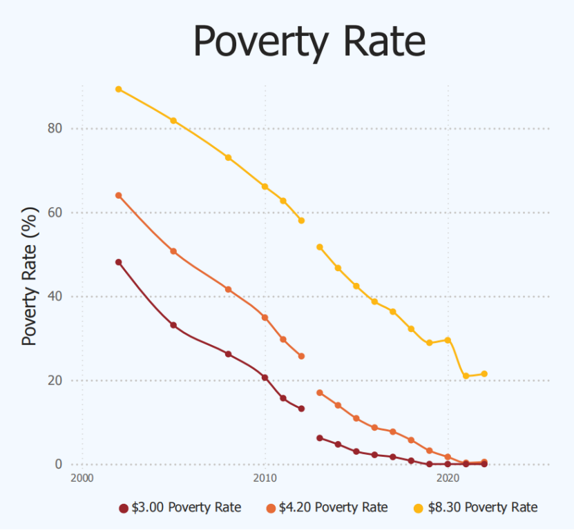 2025年6月,世界银行基于2021年购买力平价更新了全球贫困线的划分标准,设定为每人每天3.00美元,取代了此前基于2017年购买力平价的每人每天2.15美元全球贫困线。国际贫困线的上调部分反映了通胀水平,部分是因为多个低收入国家上调了贫困线标准。