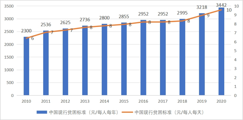 按照这一标准,由于物价水平变化,在不同年份需要进行年度调整,以确保其代表的生活水平不变,2011年是每人每年2536元、2012年每人每年2625元、2013年每人每年2736元、2014年每人每年2800元、2015年每人每年2855元、2016年每人每年2952元、2017年每人每年2952元、2018年每人每年2995元、2019年每人每年3218元、2020年每人每年3442元。同一条标准在不同年份虽然数值不同,但都代表了同一生活水平,年度间可比。为了方便理解和比较,我将其折算为每人每天,2020年为每人每天10元,参见下图。