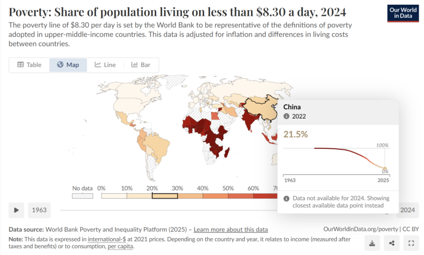 如果按照2021年价格的每人每天8.30美元的中上收入国家的贫困标准,2022年中国大约21.5%的人口(3.04亿人)处于这一贫困线下。