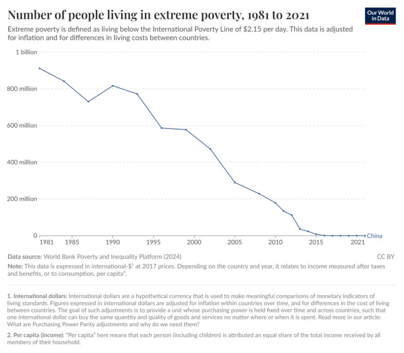 2020年中国消除绝对贫困,为世界减贫事业贡献了四分之三的力量,成就之大可谓前无古人。同时也需要认识到,中国消除的是按照低收入国家标准定义的绝对贫困,而不是按照中上收入国家标准定义的绝对贫困,并且距离高收入国家的绝对贫困标准差距甚大,而相对贫困问题更将会长期存在。为此中国确立了到2035年“全体人民共同富裕取得更为明显的实质性进展”的新目标。中国的脱贫无穷之路,依然任重而道远。
