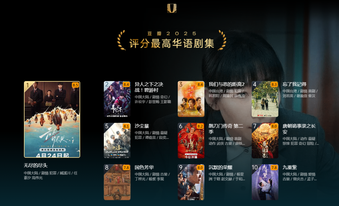 在刚刚公布的豆瓣 2025 评分最高华语剧 Top10 中,续集等系列化作品占据了一半席位。《唐朝诡事录之长安》超点完结一个月,至今仍稳居云合数据每日霸屏榜市占率TOP10;东北武侠风情景喜剧《鹊刀门传奇2》延续了前作气质,在类型融合上持续获得高分评价;《异人之下之决战!碧游村》也在播出过程中不断突破原有二次元圈层壁垒,让更多非核心受众完成“补课式追剧”。这些作品并非偶然走红,而是在观众熟悉的人物、世界观和叙事基础上,完成了一次又一次向前推进。