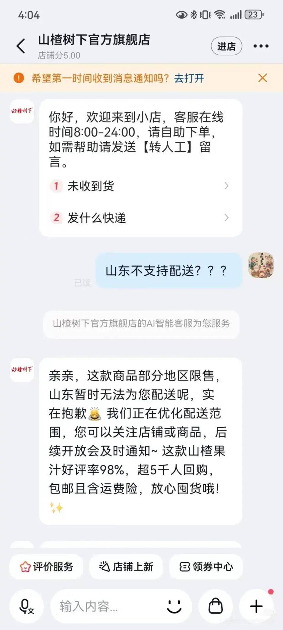 风暴始于一张与山楂树下抖音官店客服对话的截图。在沟通中,客服表示商品在部分地区限售,暂时无法配送至山东地区。