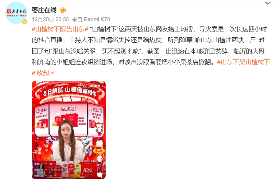 2025年岁末,山东人的朋友圈被一抹扎眼的“红色”刷屏了——不是过年的喜庆,而是成箱的“山楂树下”饮料被倾倒在下水道里的愤怒。