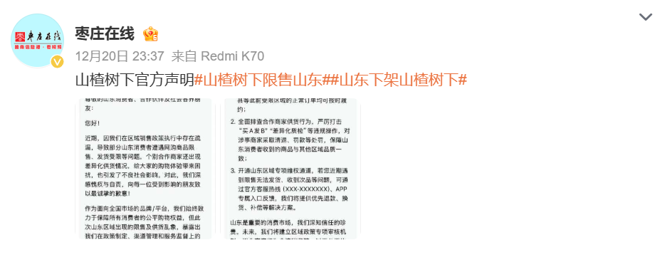 这份“官方声明”被多个自媒体转载并广泛流传,似乎坐实了山楂树下曾对山东进行区别对待。