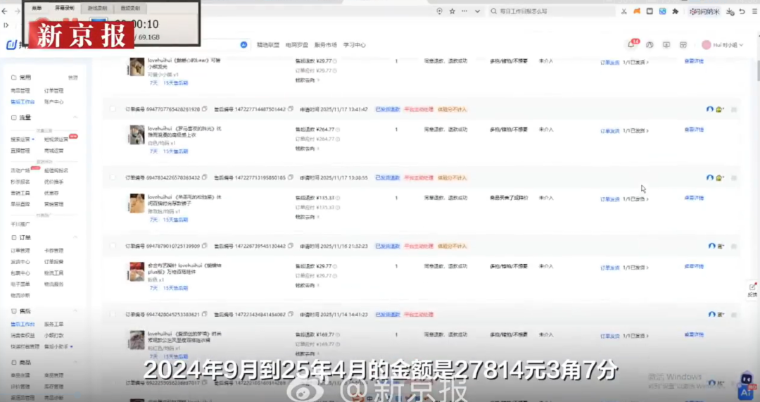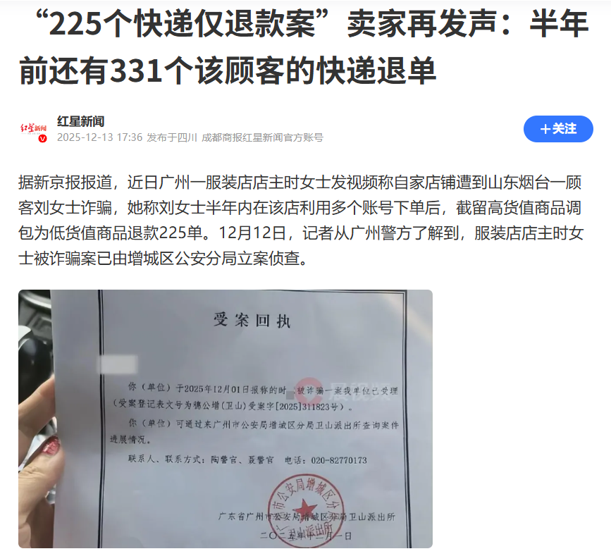 要理清这一事件的根源,或许还要追溯到不久前新京报追踪的一起诈骗案:一服装店店主发视频称遭到山东烟台一顾客刘女士诈骗,她称对方半年内利用多个账号下单,调包为低货值商品并进行退款,共计225单。