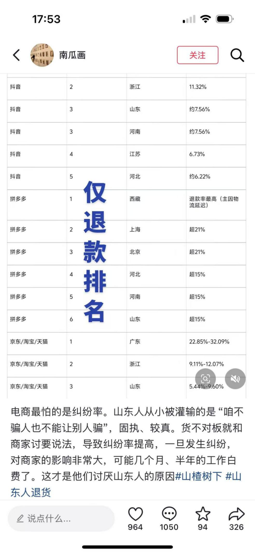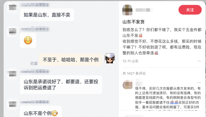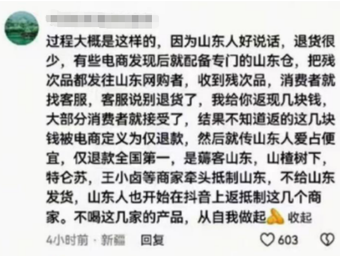 随后又有人传言,少数山东地区消费者滥用“仅退款”条款,一些商家会对山东区域进行拉黑。同时也出现了方向相反的传言:山东地区消费者好说话不退款,因此部分商家建立“AB仓”将次品发往山东。