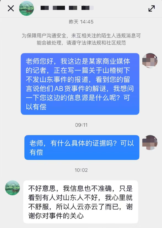 之后,网上又传出山楂树下直播间工作人员对山东消费者作出不当发言。剁椒对相关资讯进行了溯源,未能发现保留主播原声的录屏。山东本地资讯媒体@枣庄在线 对过程作了文字记录,但内容同样显示,事件发酵时是以截图形式在群聊中流传开来的,没有视频留存。