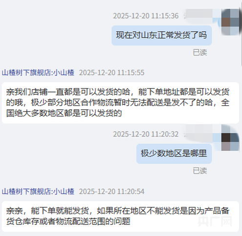 事件发酵之后,多家媒体以消费者身份实测,在淘宝、京东、拼多多等平台的官方旗舰店下单,将收货地址设为山东济南、青岛等地,平台均显示正常下单、正常发货。
