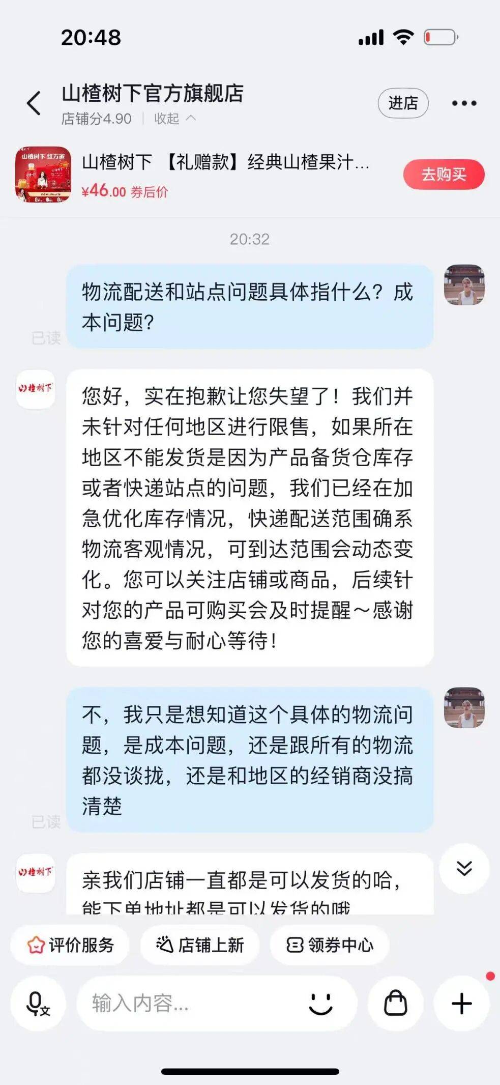 剁椒也向山楂树下多个官方旗舰店进行求证,在询问当初回复“不发货”的抖音旗舰店时,客服表示,不发货是物流配送范围、站点和库存原因。