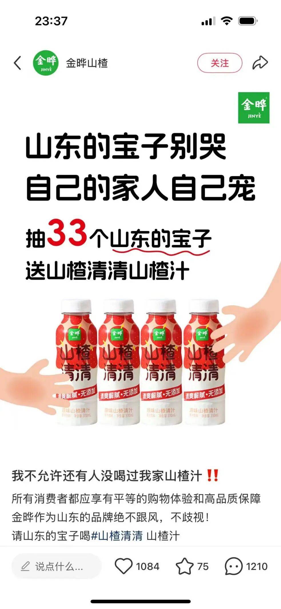 在此次事件中,网友就自发在社交媒体上推荐了其他品牌的山楂饮料,比如山东本土的金晔,老牌的汇源山楂汁等。而被提到的品牌们也纷纷下场,不仅想接下这泼天的流量,更想承接住山楂树下流失的山东消费者。
