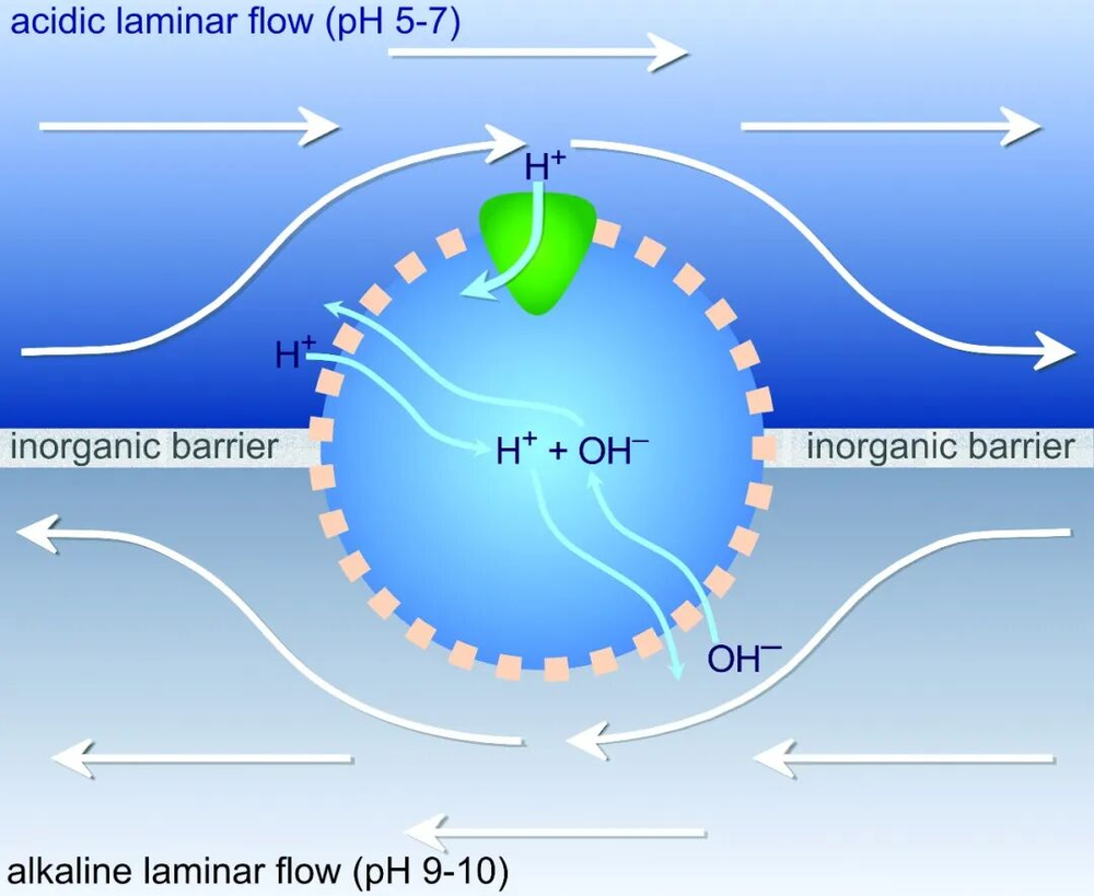 碱性深海热泉酸碱差催化质子梯度反应。以上这些环境支持CO2+H2生成CH4甲烷(有机物)的化学反应,Lost City至今中也产生少量甲烷,这个反应将释放热量,且这个反应本身就是前文中提到的氧化还原反应,其中氢气提供质子和电子,而二氧化碳则是接收方。然而,问题是二氧化碳和氢气发生反应需要能量输入,且反应难度很高。然而,碱性深海热泉提供了相当独特的环境,其内部呈现碱性,而外部海洋是酸性,这种酸碱差给二氧化碳和氢气反应创造了得天独厚的条件(如下图)。如果氢气在PH=10的碱性环境,而CO2在PH=5的酸性环境,它们就会合成CH2O有机物,而质子和电子也会相应释放,从而产生类似质子梯度。依靠质子梯度可以产生有机物(有机代谢),同样依靠质子梯度,也可以合成类似ATP(能量代谢)。这个反应在纯酸和纯碱环境下都不会发生,因此只有碱性深海热泉能够提供独特反应条件。以上并不能断定深海热泉就是生命来源,但是从能量来源来看,目前来说只有它是完美符合条件。