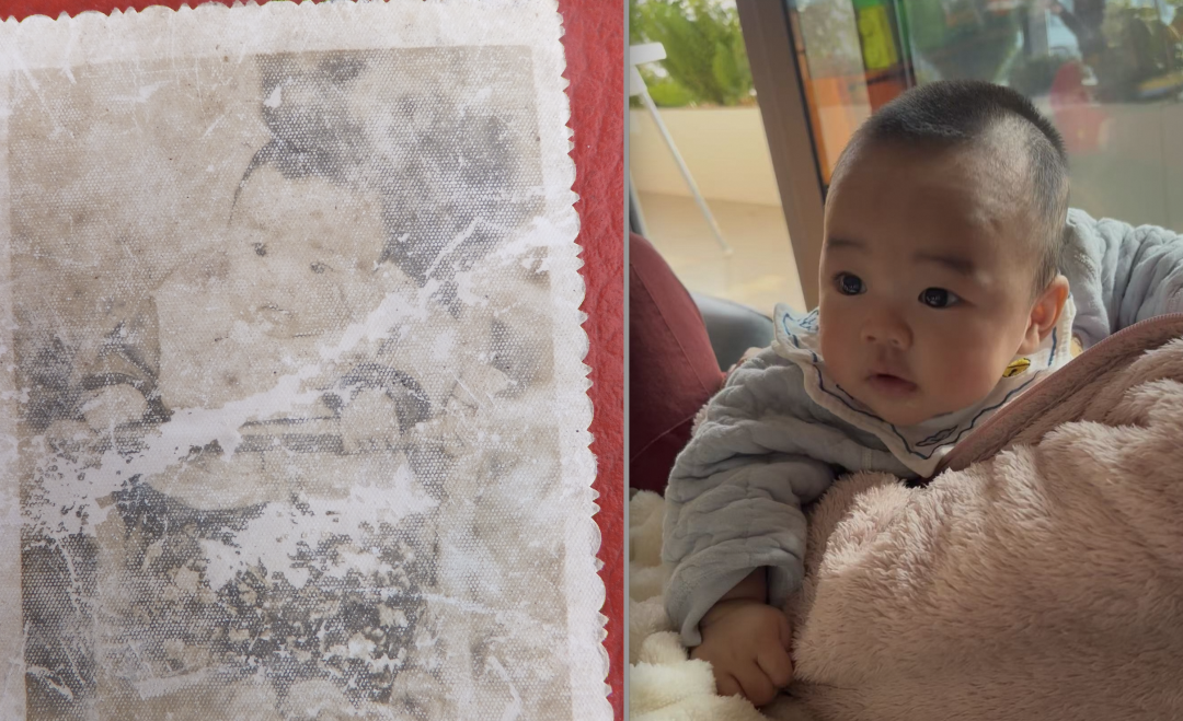 那天,我突然有种感觉,小柚子可能很像小时候的我,因为他汗毛多,皮肤黝黑,很像我小时候接收到的评价。我翻箱倒柜,找了好几个硬盘,终于找到我仅有的 1 岁前黑白照片的扫描件。这么多年后,照片已经斑驳不清,但上面圆溜溜的眼神和脸蛋还很能辨认出来,和今天的小柚子几乎一致,也是一颗小卤蛋!