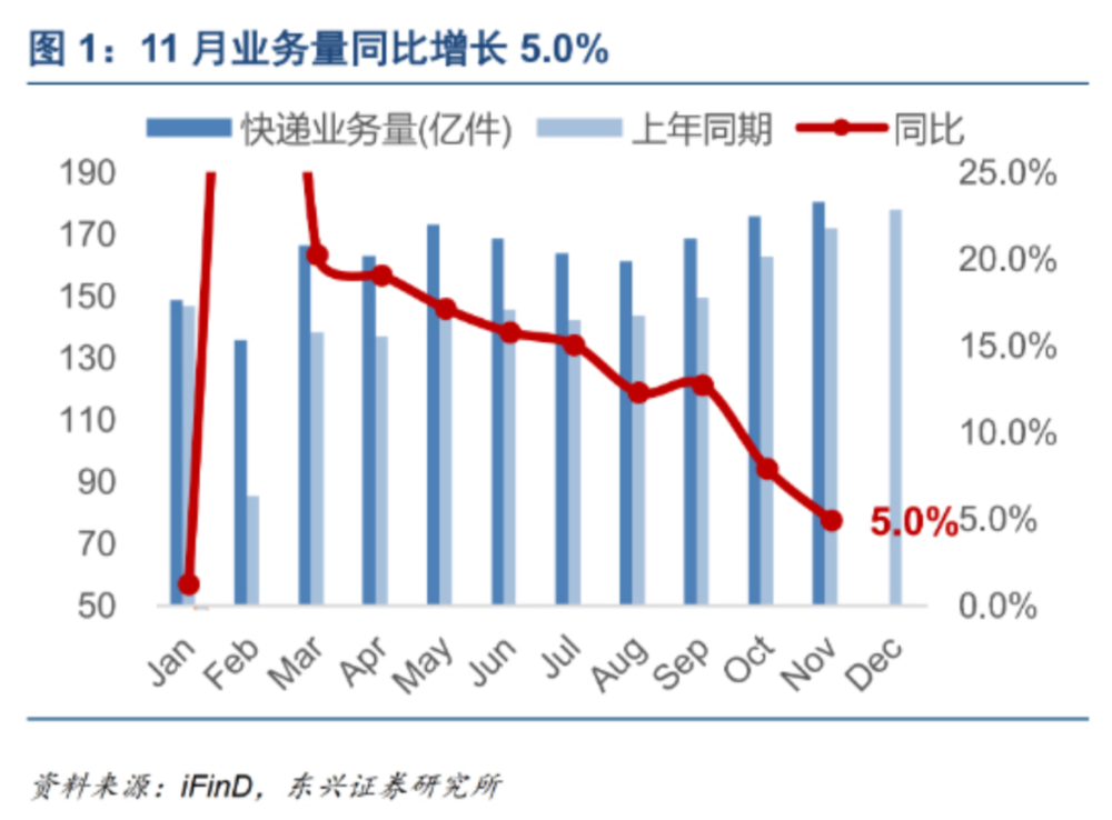当前,快递行业的增长曲线已显著放缓。从数据看:继今年10月快递行业业务增速降为个位数7.9%,11月进一步下降至5%,预计2025年快递业务量增速将回落至15%左右,较前两年超20%的高增长明显换挡;更值得关注的是收入增速的放缓更为突出,2025年1-11月仅增长7.1%,显著低于前两年13%以上的收入增速,甚至今年11月呈现同比下降趋势(-3.7%)。行业整体已从爆发期逐步进入中低速增长阶段。