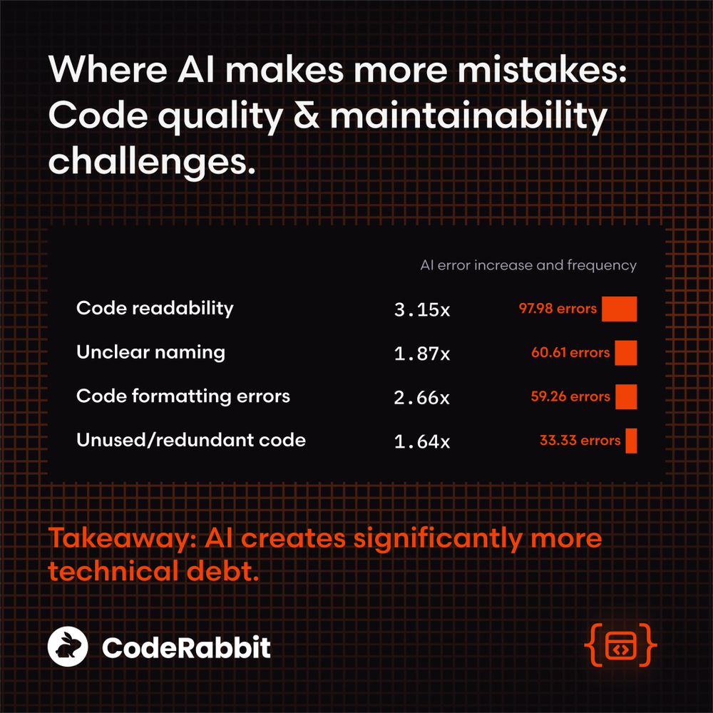 CodeRabbit的报告指出,这些问题正在像滚雪球一样累积成巨大的“长期技术债”。