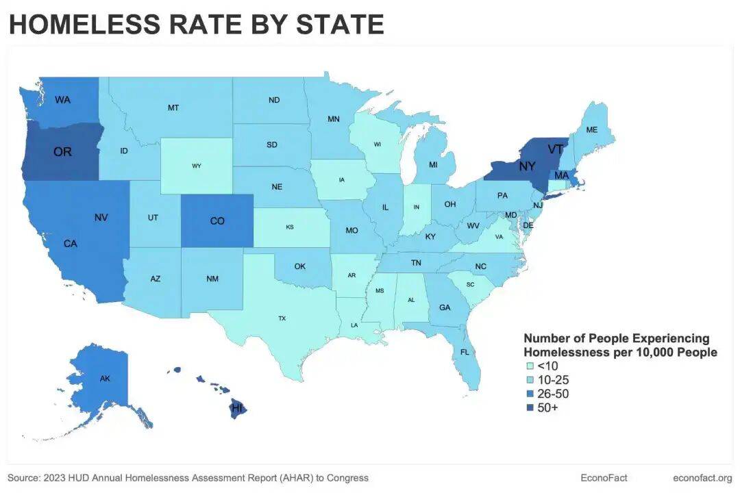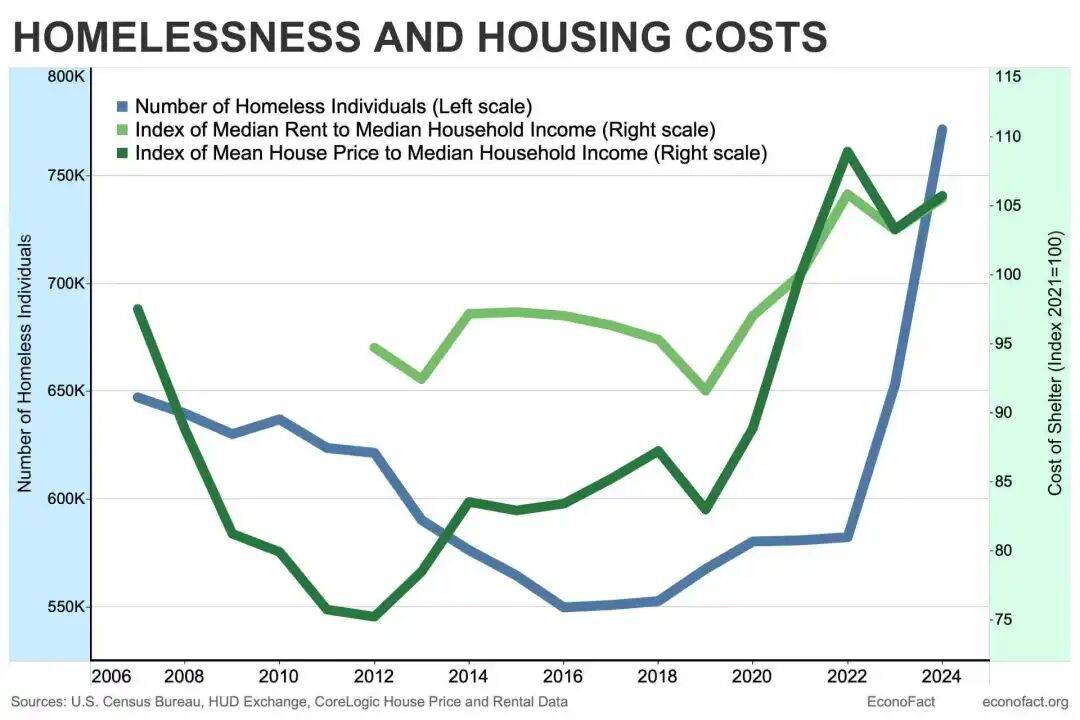从上至下的三个指标:美国流浪汉人数、美国的租金中位数与家庭收入中位数之比、美国平均房价与家庭收入中值之比指数。(数据截止至2024年)
