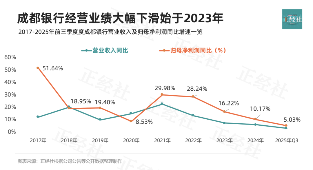 此次处罚的时间点也很敏感:成都银行刚刚公布的2025年三季报显示,第三季度营收出现负增长,归母净利润仅同比增长0.17%,与三年前动辄两位数的高增长形成了强烈反差。