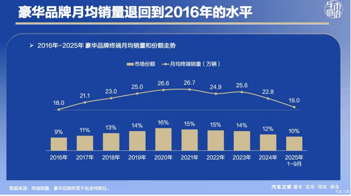 据汽车之家数据显示,豪华品牌的销量在2021年触顶,市场份额达26.7%,但今年1月-9月的市场份额已经退回到2016年的水平。此外,42%的豪华品牌车主已经置换为了中国品牌。