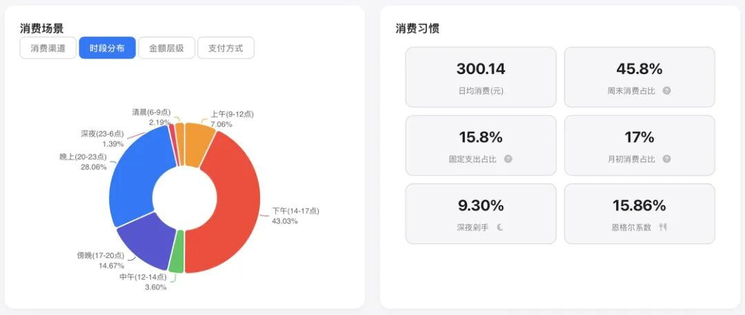 诚然,消费洞察页面所呈现的数据,或许你在年度或分类视图中,通过繁琐的参数筛选也能拼凑出来。但这个页面的核心价值在于「显影」——它将那些潜伏在日常流水之下、不易察觉的行为惯性,直观地拉出水面。