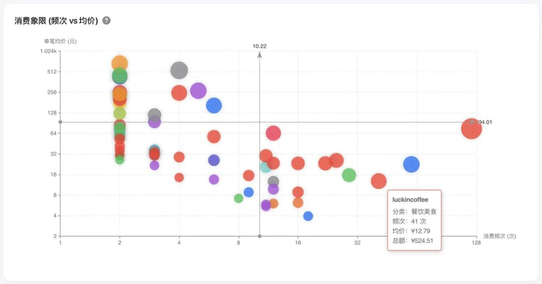 第二象限(低频高价):「得物」「海底捞」等占据了这里。通过色块的大小(代表总金额)和颜色(代表消费分类),你可以清晰地看到哪些分类的哪些商家在你的生活中占据了「统治地位」。