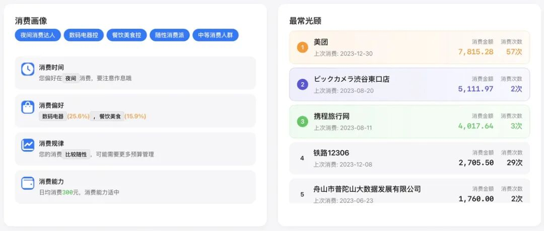 消费画像、最常光顾、消费场景、消费习惯等与之前保持一致,进行了部分细节优化,也支持大额/小额交易的筛选。