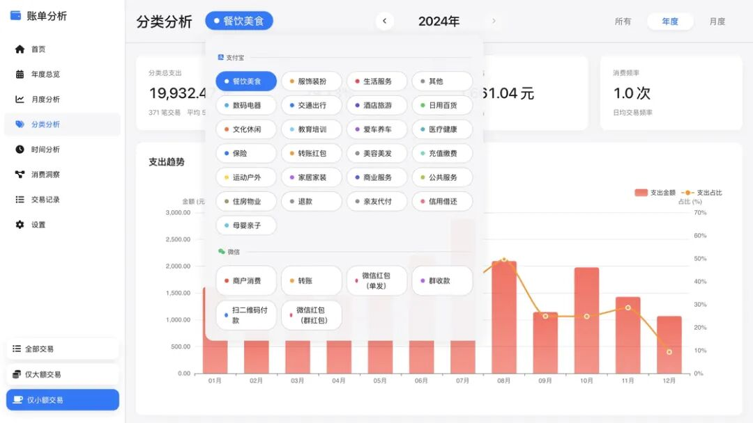 为了解决支付宝与微信分类逻辑的差异,在年度和月度分析的饼图中,我采用了分列展示的设计。右侧图例清晰地标示了数据来源,配合鼠标悬浮的高亮联动,你既能看到总览,也能快速厘清某一类支出究竟是来自支付宝还是微信。