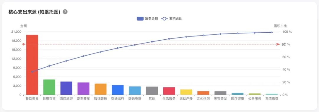 基于帕累托法则(80/20法则),我绘制了占比柱状图与累积占比80%的虚线。结合筛选功能,这幅图变得极具洞察力: