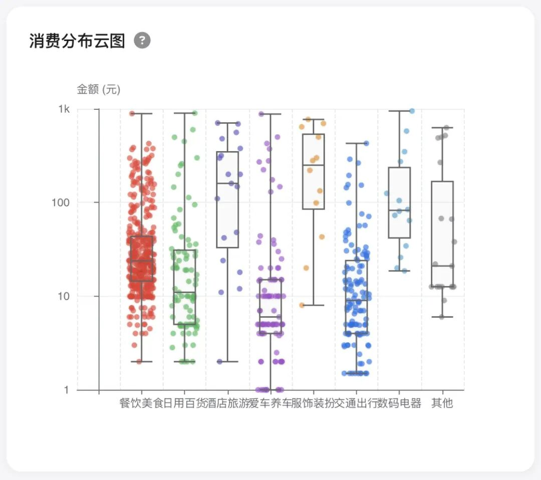 将TOP8分类的每一笔消费打散成点,投射在坐标轴上。点击某个分类可以展开细节,左侧悬浮可展示数据概况(最大值、最小值、均值、中位数),右侧则为每笔消费的点图。你可以直观地看到「餐饮美食」虽然点多,但密集分布在10-50元区间;而「数码产品」的点虽然稀疏,却个个位置极高。