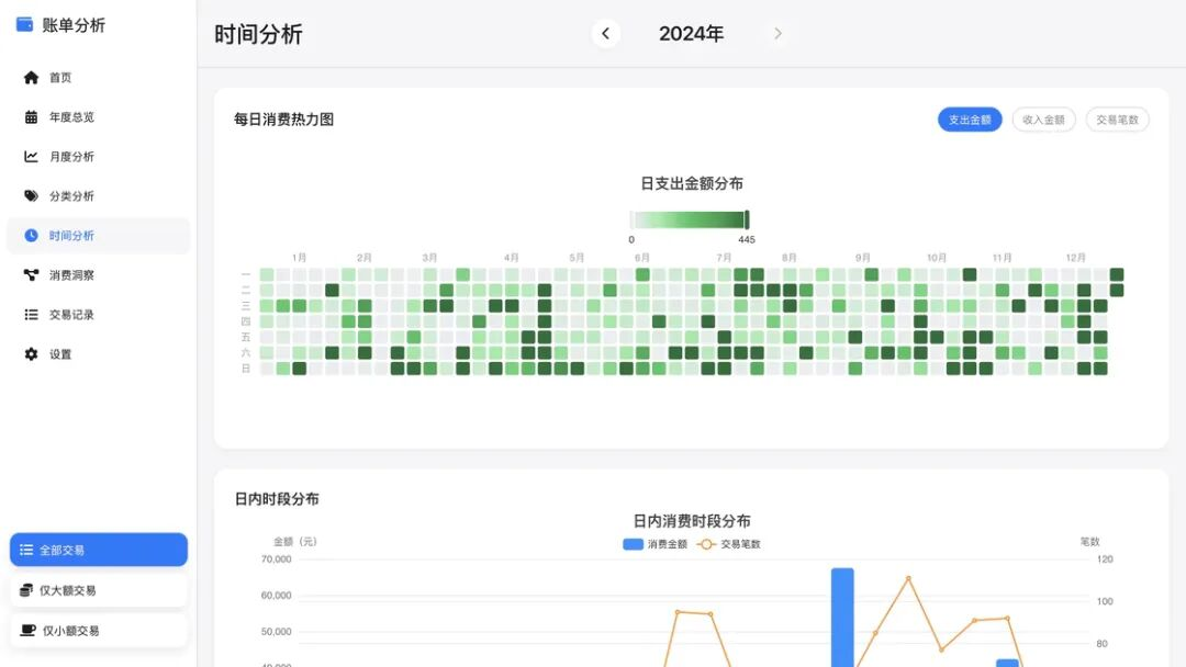 此外,时间分析页面的每日消费热力图更新为GitHub风格,支持在支出、收入、交易笔数之间切换。借助深浅不一的绿色方块,你仿佛能看到自己一年生活消费的「commit记录」。也可以给我一个错觉——只看消费记录的话,我也是全年笔耕不辍的骨灰级程序员了。
