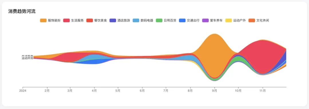 用于展示主要分类在年度时间轴上的流动占比。不同于折线图的刚硬,河流图的起伏更能体现出消费重心的推移——比如年初的河流主干是「置办年货」,到了暑期则变成了「旅游出行」。