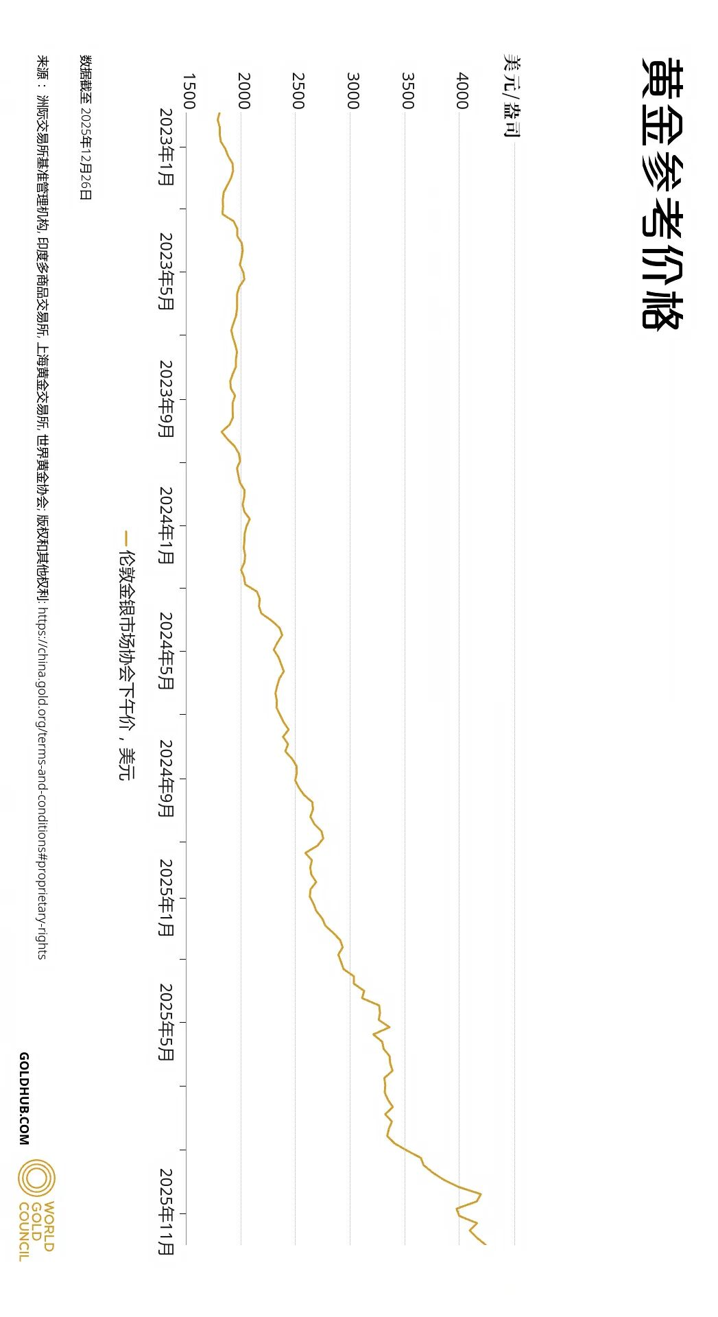 然后金价开始往上走。2020年突破2000,2023年冲到3000,现在在3800到4500之间摇晃。
