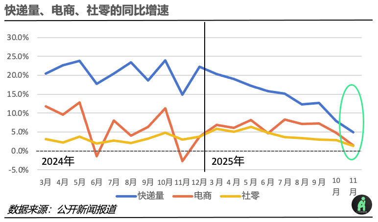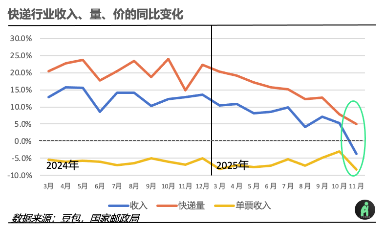 可能的原因是今年9月正式实施的快递反内卷,多地上调快递底价0.1~0.3元不等,这对快递量产生了冲击。有三条传导链: