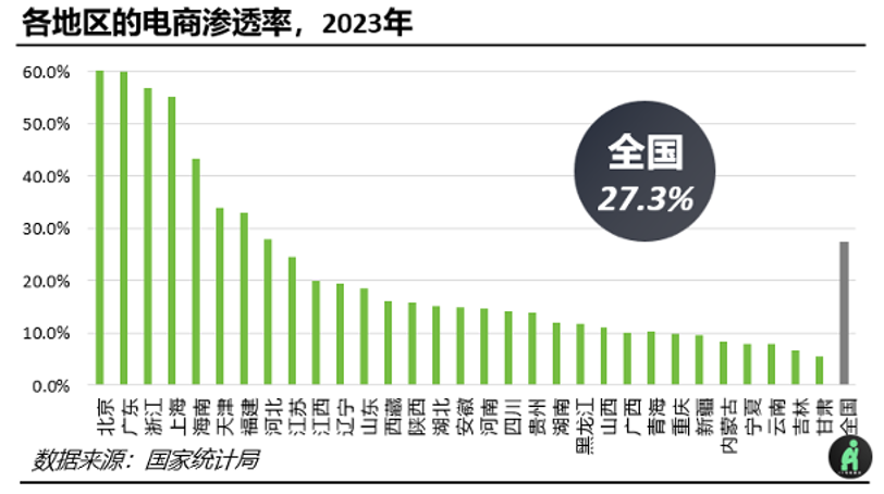 1)全国电商渗透率27%,背后是一线城市的渗透率超过50%,四五线城市的渗透率10%。