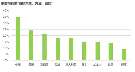 按照高盛的测算方式,剔除社零中的汽车、汽油和餐饮,2025年中国电商渗透率35%,远高于美国的24%、欧洲的18%、东南亚的21%。