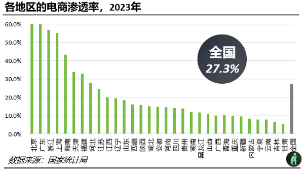按照统计局2023年的数据,全国电商占社零27.3%,但北京、广东、浙江、上海四地的渗透率已经到了55~60%的区间。
