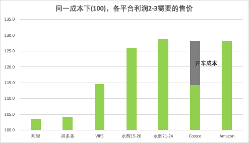 选择GMV为分母,实际上是以售价为基准,看价值链的分布,神奇的是不同公司的经营利润/GMV都在3%上下,Costco略高一点。