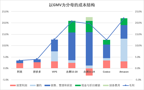 我们以GMV为分母,来拆解线上线下零售的成本结构差异。