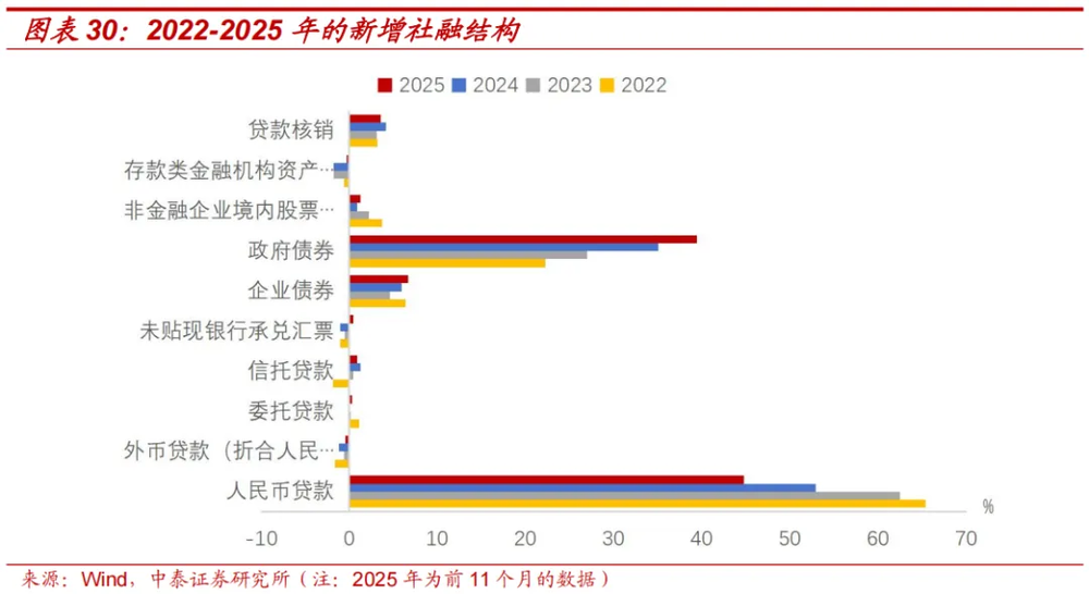 从年度社融增量的结构来看,2022-2025年,人民币贷款占比呈下降趋势,目前约占社融增量的一半左右。政府债券占比则从2022年的22.3%上升至2025年前11个月的39.4%。这两项合计占比稳定在85%-90%左右,因此在后面的预测中,重点分析人民币贷款及政府债的情况。