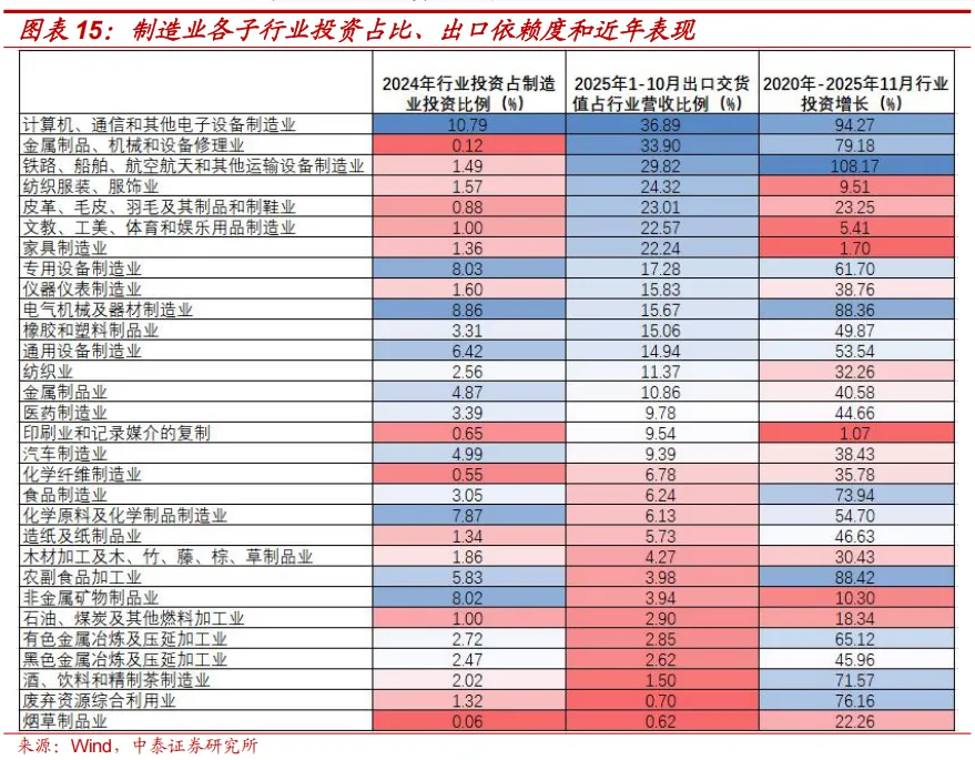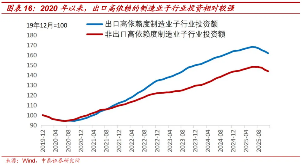 如果将2025年1-10月出口交货值占行业营收比例超过14%的行业,称为出口高依赖行业的话,可以发现2020年到2025年6月,出口对制造业投资有正向拉动。这5年6个月的时间里,出口高依赖的12个制造业子行业投资额增长了68.1%,对比来看其它18个制造业子行业的投资额同期增长了48.1%,两个增速之间有20个百分点的缺口。