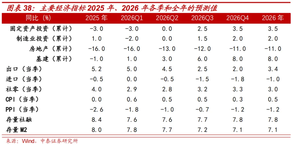 基于上述分析,我们对主要经济指标2025年全年增速、2026年各季度增速和年度增速的测算,如下表所示。
