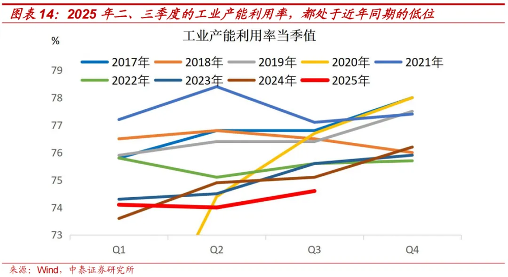 制造业以民营企业为主,“供强需弱”带来的盈利压力,会抑制企业的资本开支意愿。2025年工业生产强劲,工业增加值同比持续高于三大需求的增速,不过即使如此,2025年二、三季度中国工业产能利用率也分别只有74.0%、74.6%,都是2017年以来的同期最低水平。“供强需弱”的问题明显,抑制企业投资意愿。制造业子行业中,食品制造业、化学原料及化学制品制造业的产能利用率较低,三季度它们的投资增速回落较快。