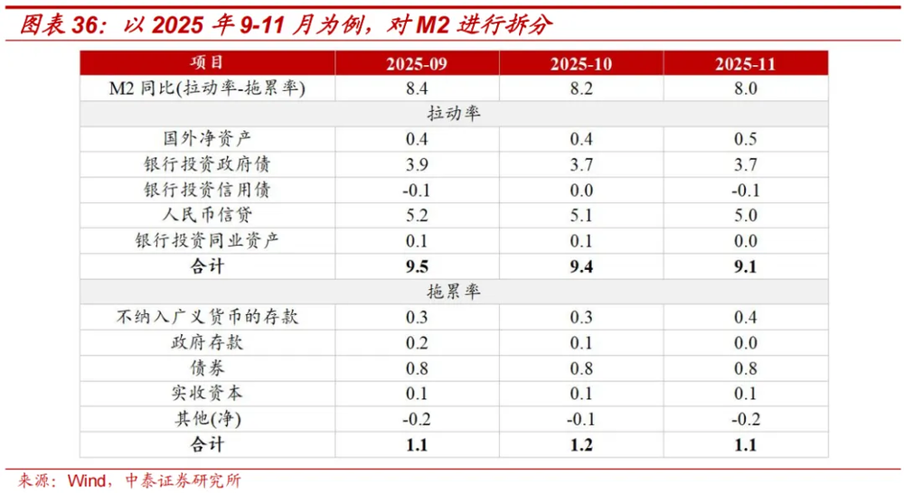 银行投资政府债:延续前文假设,2026年政府债供给为14.45万亿元,结合今年7月中旬中国人民银行金融市场司提及的“银行持有的政府债券占全部政府债券比重为70%”,并考虑到基数效应,测算得到2026年银行投资政府债对M2增速的拉动率约为3.0%。