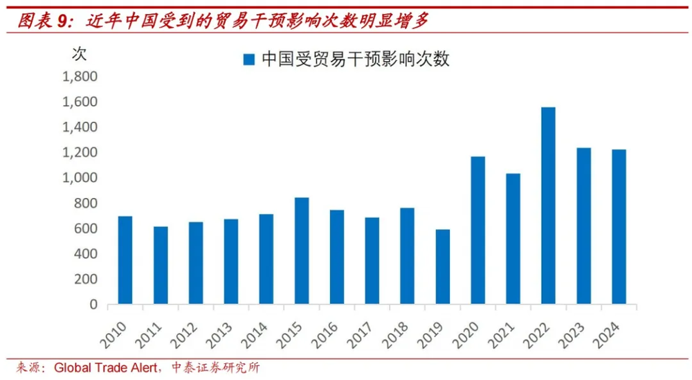 低价出口会增加贸易摩擦的风险,根据Global Trade Alert的统计,2022年即海外步入后疫情时代开始,中国受到的贸易干预影响次数就开始上升。