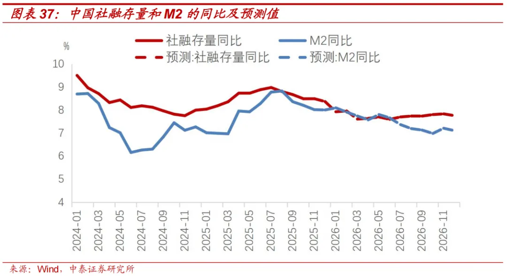 我们对2025年12月到2026年12月,社融存量同比与M2同比的月度值做预测,结果如下图所示。