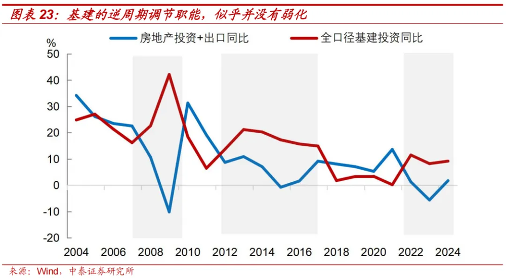 二是出口连接的产业链上下游,要大于基建投资,即出口对经济的撬动效应要大于基建。通过基建投资来对冲出口走弱,尽管能将GDP增速推升到5%左右,但是它对改善供需格局的作用,可能要小于出口强劲时。
