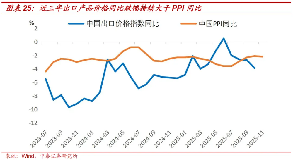 出口价格方面,2025年前9个月中国出口价格指数同比下跌2.5%,已连续3年为负值。考虑到基数效应等原因,假设2026年中国出口价格指数同比回升到0。